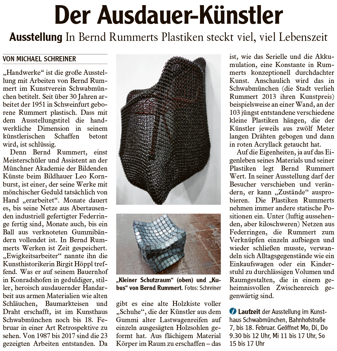 "Handwerke ist die große Ausstellung mit Arbeiten von Bernd Rummert im Kunstverein Schwabmünchen betitelt. Seit über 30 Jahren arbeitet der 1951 in Schweinfurt geborene Rummert plastisch. Dass mit dem Ausstellungstitel die handwerkliche Dimension in seinem künstlerischen Schaffen betont wird, ist schlüssig. ..."