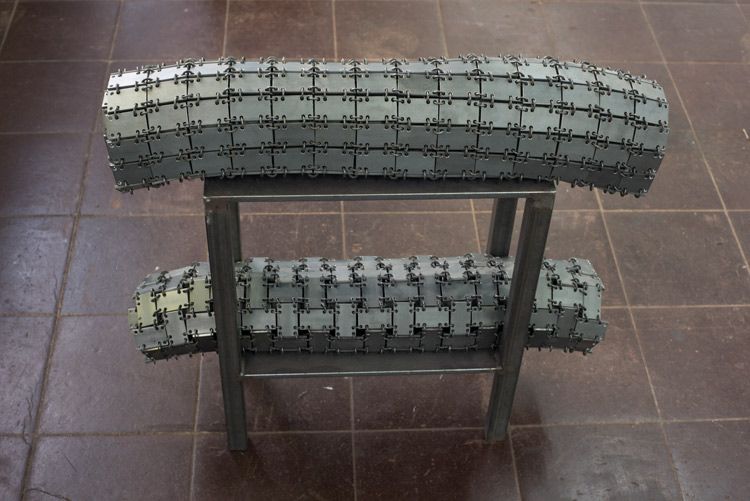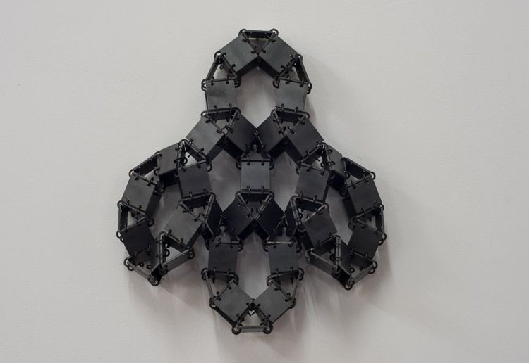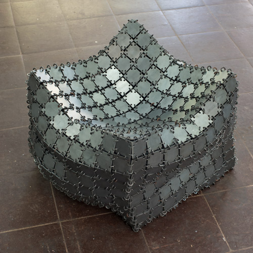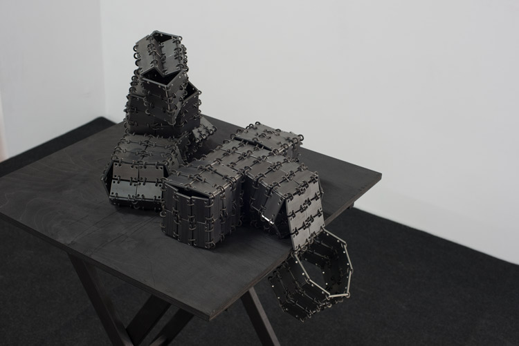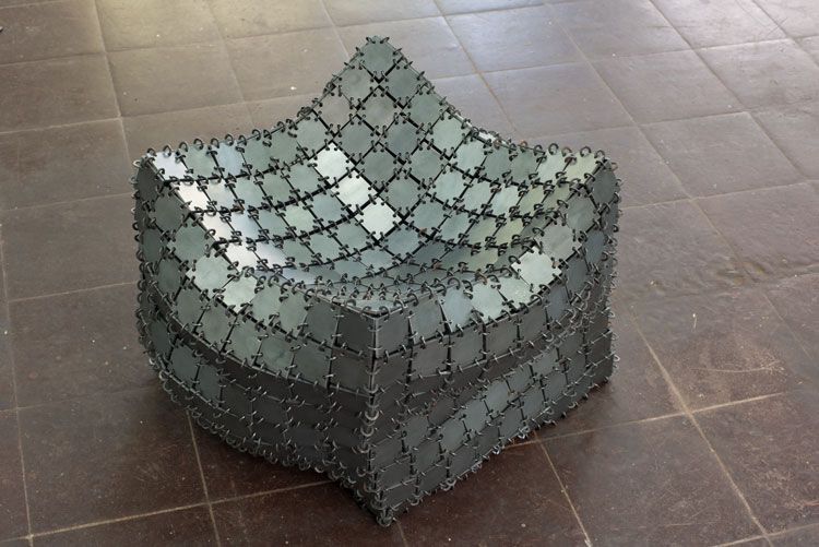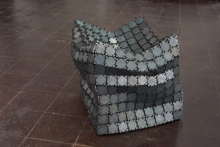 Bernd Rummert arbeitet seine Kunst eigenhändig. (Mit ganz wenigen Regelbestätigungsausnahmen: Der Grauguss TORSO ist eine reine Form aus industrieller Herstellung ist, aber dennoch ein Unikat. Und dass er sich beim Aussägen der Eisenplättchen, aus denen er seineTeppiche knüpft, von Manfred Herma und seinen Maschinen helfen lässt, versteht jeder, der schon mal Eisen gesägt hat.) In der Regel aber haben wir hier Werke, die einer mit der Hand gemacht hat. Das ist freilich banal, weil ja sogar der untalentierteste Amateur seine Pinselstudien eigenhändig anfertigt. Das bevorzugt Material von Bernd Rummert ist Eisen, und das schreit geradezu nach industrieller oder handwerklicher Methode. Bernd Rummert besteht aber auf der Handarbeit. Nichtweil er andere Produktionsformen ablehnt, sondern weil es für ihn die richtige, die angemessene ist, und das im Wortsinn: Bernd Rummert misst sich seine Werke ab: Das gilt für große Konzept, die Lebenskunst, (Eines hieß: Versuch sich um die Welt zu drehen, das heißt eine solche Menge/Länge von Draht zu verarbeiten, dass man den Weltumfangeinmal durchmessen hat.)Das gilt auch fürs kleine Objekt, das Einzelwerk.Bernd Rummert verliert nie den Körper als Maß und Basis aus dem Auge. Dabei ist er garantiertkein Körperfetischist oder Egoperformanceartist. Er bezieht sich ganz konkret auf eigenes Maß. Sei es dass er die eigene Fußgröße nimmt und in eine Form verwandelt, auf der er danneine Plastik aus Gummi entfaltet und befestigt, die wie ein Schuh aussieht, aber kein Schuh ist. Bei anderen Werken ist die Körpergröße des Künstlers der Maßstab. (Der genaue Wert wird hier nicht verraten, um es eventuell anwesenden Plagiatoren nicht zu leicht zu machen). Der Raum ist das Ziel. Am Anfang aber war die Zahl. Die Zahl als Körpergröße und Erdumfang, als Anzahl von Federringen in einem Quadrat von 50 x 50 cm, als Anzahl von quadratischenMetallplatten, die man benötigt um einen Teppich von 150 cm Länge zu flechten. Bernd Rummert kann rechnen. Er weiß wie lange es dauert, bis man, sagen wir 25000 Federringe zu einem Kettenhemd verknüpft hat. Er könnte vielleicht auch ausrechnen, wie weit er als Schwimmer auf einer 50-m-Bahn käme, wenn er die gleiche Zeit aufwenden würde. Aber damit rechnet er nicht. Obwohl Rechnen und Planen zu seiner Art von Kunst gehört. Aber auf der anderen Seite ist die Freiheit in den Formen, die man nicht berechnen kann, die man nur spüren kann, denken kann. Die Messwerte sind das eine, das Material ist das andere. Aber ohne Idee bliebe nur der Schrotthandel.