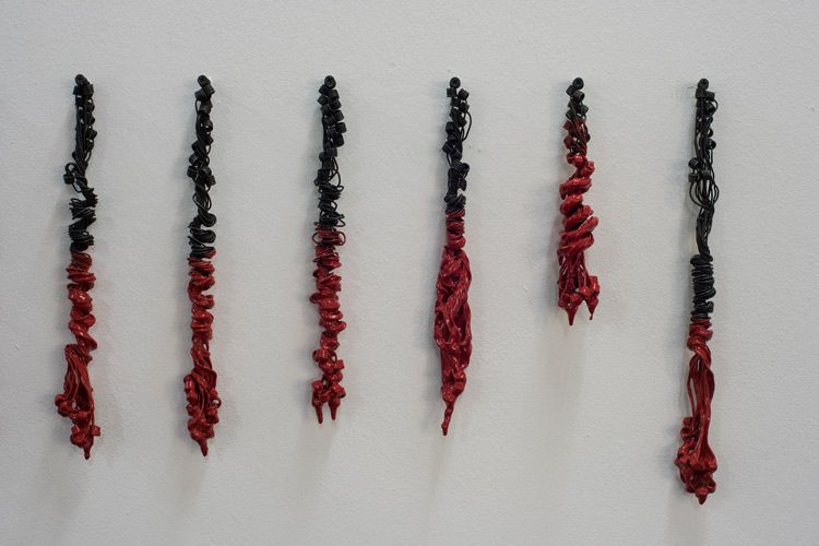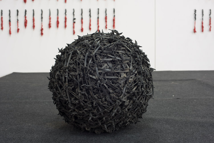 Ein anderes Fundstück, nicht ganz so edel wie Man Rays Quelle, ein Nachttopf oder eine Bettpfanne soll nicht etwa in einem spießbürgerlichen Umfeld provozieren, vielmehr etabliert es hinterm und unterm Vorhang einen sehr privaten Raum, hier weniger Schutz- als Schamraum. 103 Ansichten von Draht. 16 Teile aus 75 cm langen Drahtstücken bilden die Grundstruktur jeder dieser Formen. Dasheißt: in jedem Teil sind 12 m Draht verarbeitet, in der gesamten Installation 1236 m. Bernd Rummert geht planmäßig vor, unterzieht sein Material einem definierten technischen Verfahrenund freut sich am Ende über die ungeplante und unplanbare Form, die dann noch einenSchatten dazugibt. Die Wandarbeit: ausgedacht, abgemessen, eingetaucht und festgeschraubt. Mehr nicht. Und doch erscheint es mir persönlicher, als wenn andere zwölf Farbhaufen auf einer Leinwand hinterlassen und dann auf Verdunstung und Erosionen hoffen, damit etwas Unverwechselbares dabei herauskommt. Oder als wenn ein anderer zwölf wichtige Begriffe dekliniert und die Bedeutung wie eine Monstranz vor sich hin hält, halb ohnmächtig vor der Bedeutsamkeit dereigenen Gedanken.